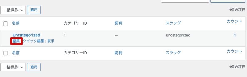 名前を変更する場合は、カテゴリー画面の右側に「uncategorized」がありますのでカーソルを近づけます。
